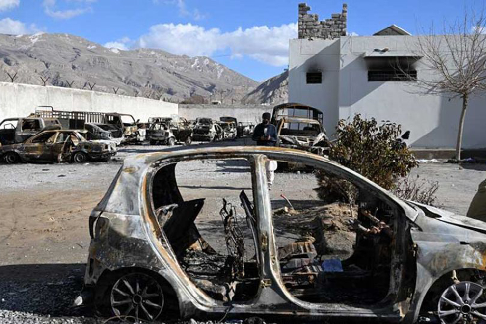 A man stands beside burnt vehicles inside a torched police station on the outskirts of Quetta on February 1, 2026, a day after an attack by Baloch separatists. PHOTO: AFP