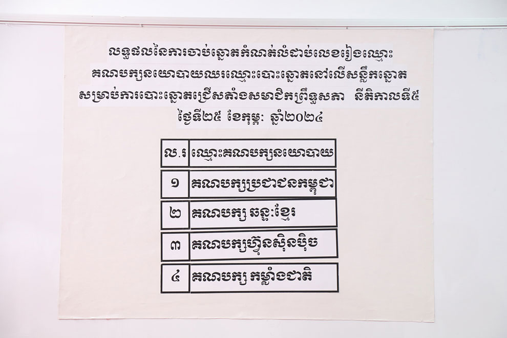 NEC secretary-general Tep Nytha announced that the ruling Cambodian People’s Party (CPP) had been drawn in the first spot, with the Khmer Will Party in the second, the royalist FUNCINPEC in the third and the Nation Power Party in the fourth.