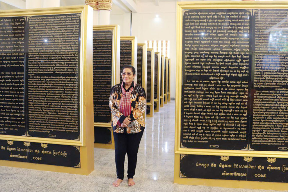 Hun Sinat, sister of former Prime Minister Hun Sen, poses for a photo with the Buddhist teachings at the centre. Nhek Buntha via FB