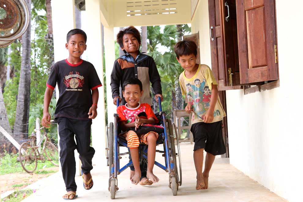 Children help their peer with disabilities. UN CAMBODIA