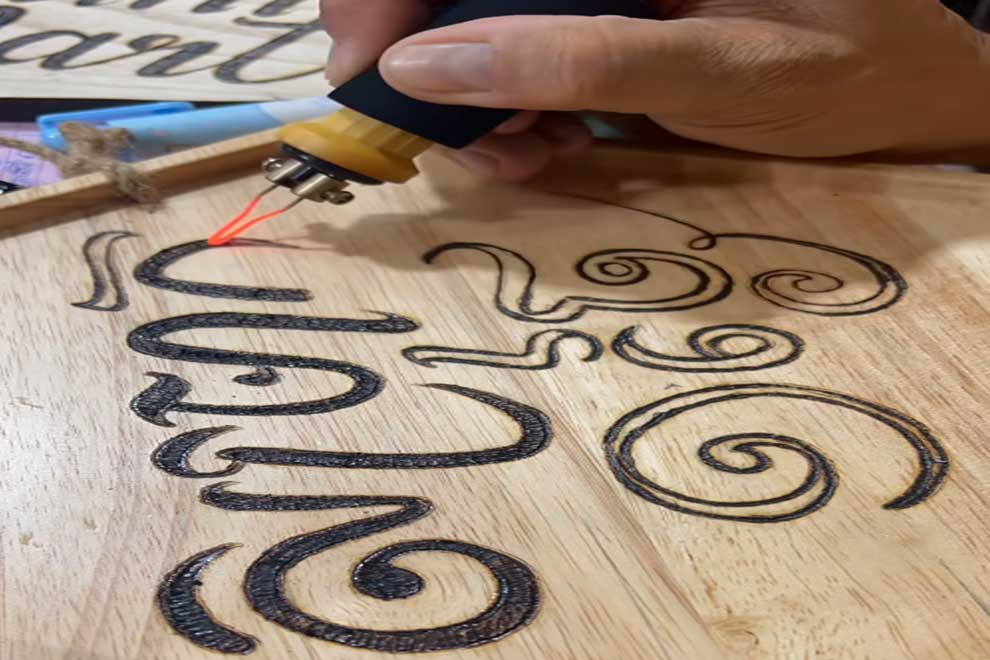 Artistic creation commonly involves traditional tools like pens, pencils or brushes. However, a local craftsman utilises a pyrography pen, an electric device derived from a soldering iron. This tool allows him to burn intricate patterns and Khmer lettering onto wooden surfaces, resulting in unique and attractive artworks.