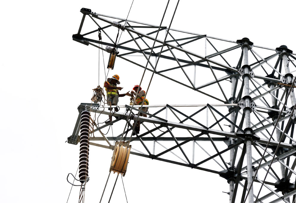Electricians install electric power lines on a steel power pole along Hun Sen Boulevard in Phnom Penh’s Meanchey district on Sunday. Heng Chivoan