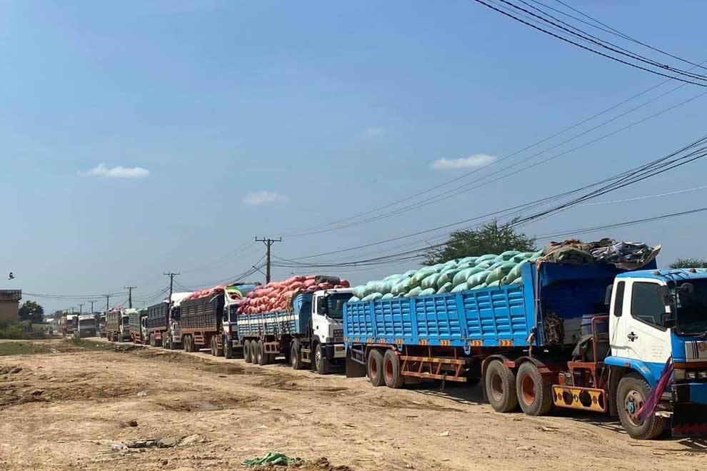 Heavy trucks prepare to transport goods across the Cambodia-Vietnam border. FB