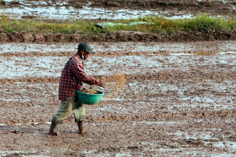 A farmer sows rice seed in his field in 2020. Heng Chivoan
