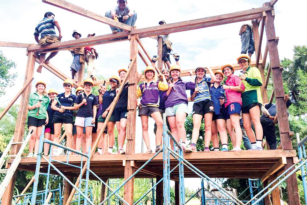 Volunteers pose for a picture on the site of a wooden house they are helping to build for a poor family in the Kingdom. Photo supplied