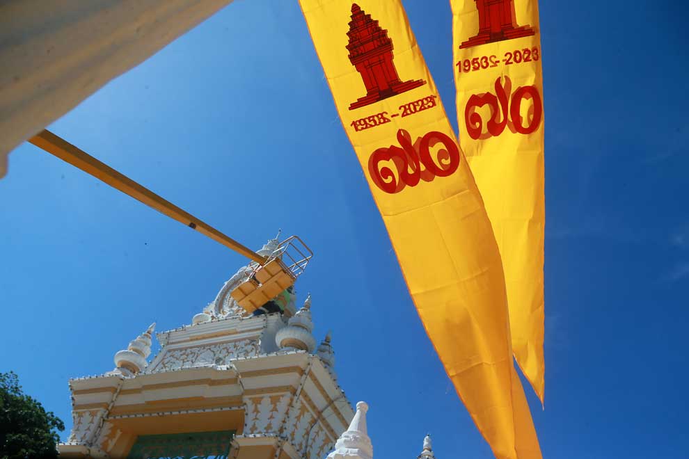 Workers decorate the entrance of the Royal Palace, in preparation for the Independence Day, in Phnom Penh. Heng Chivoan