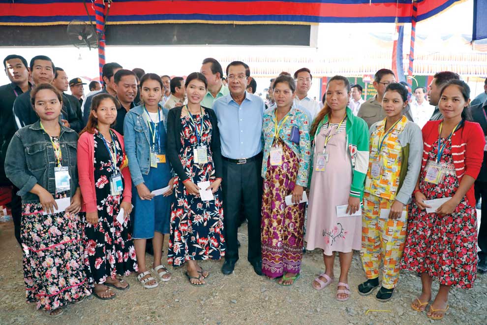 Outgoing Prime Minister Hun Sen poses for photos with garment workers in Kandal province in May. SPM