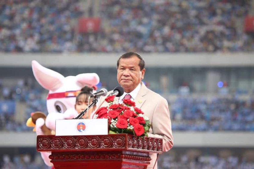 Thong Khon, president of the Cambodian Gymnastics Federation, speaking at the closing ceremony of the National Sports Competition on November 29. PHOTO SUPPLIED