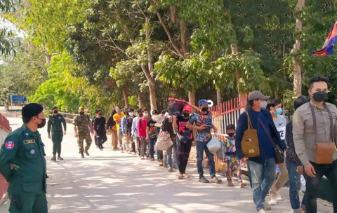 Cambodian migrant workers enter Thailand through the Poipet border in April. CENTRAL