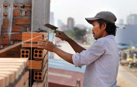 Construction workers prepare supports for a new overpass in the capital’s Meanchey district. Heng Chivoan