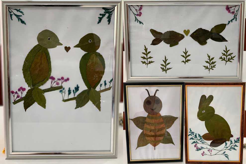 Working with larger leaves, such as those from jackfruit (Artocarpus heterophyllus) or jambolan (Syzygium umini) trees, offers the opportunity to craft the various body parts. Smaller ones typically serve for creating legs and wings. Occasionally, the team turns to the internet for inspiration, replicating the beautiful images they find. Once completed, these leafy works of art are affixed to paper, framed in glass and displayed at high school events.