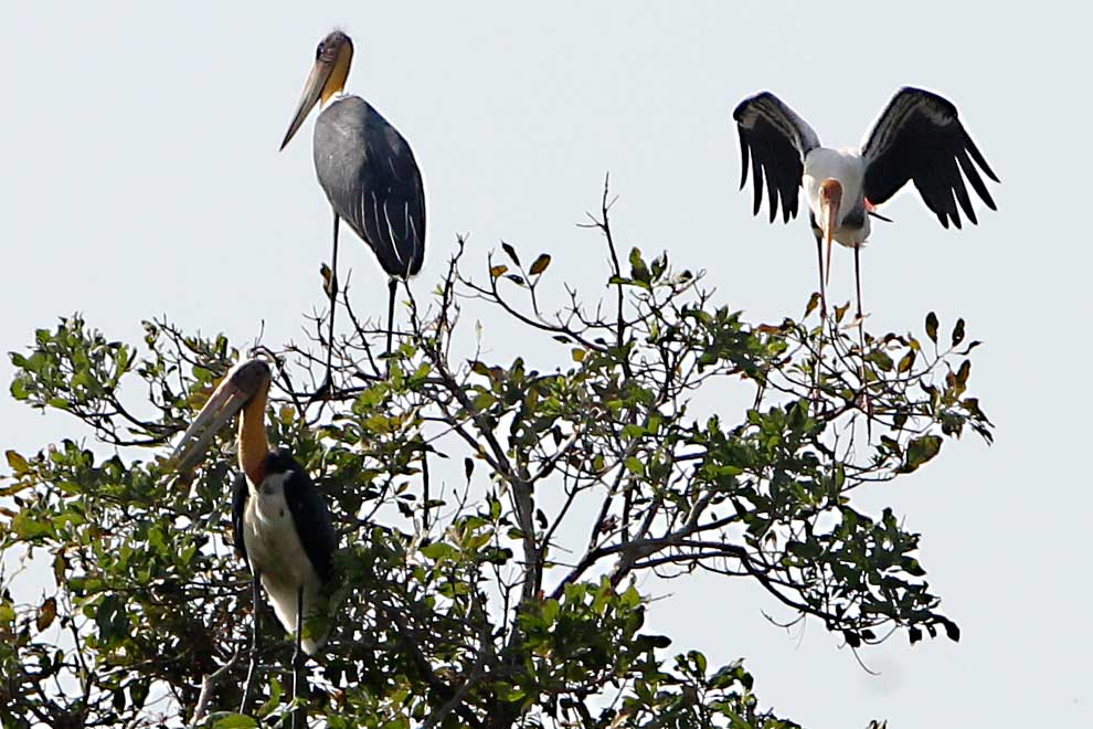 A trio of rare lesser adjutants perch high atop a tree at the Prek Toal site on January 21.Heng Chivoan