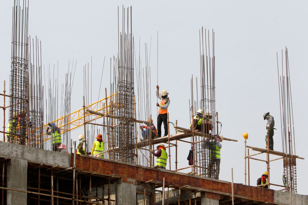 A construction worker prepares rebar cages for the foundation of a high-rise building in the capital’s Meanchey district last year. Heng Chivoan