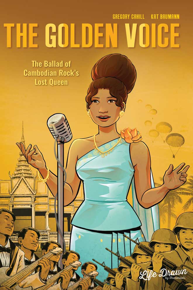 An illustration from, and the cover of, Golden Voice The Ballad of Cambodian Rock’s Lost Queen. GREGORY CAHILL