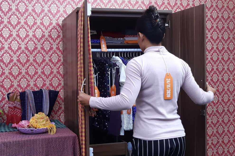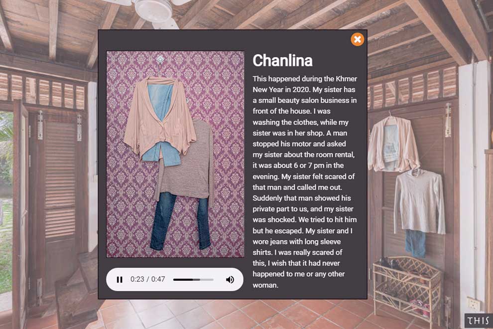 In another section of the virtual exhibition, clothing hanging on a wall tells the story of a victim of harrassment.Viewers can interact with the clothes and read or listen to the associated story in Khmer or English. Photo supplied