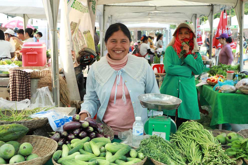 A woman smiles as she sells vegetables at a flourishing local market. AUSTRALIAN EMBASSY