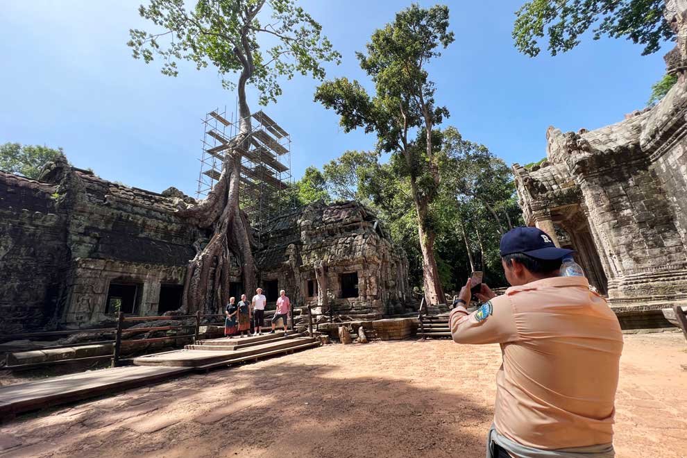 A tour guide photographs travellers during a visit to Ta Prohm Temple in Siem Reap on July 17. Hong Menea