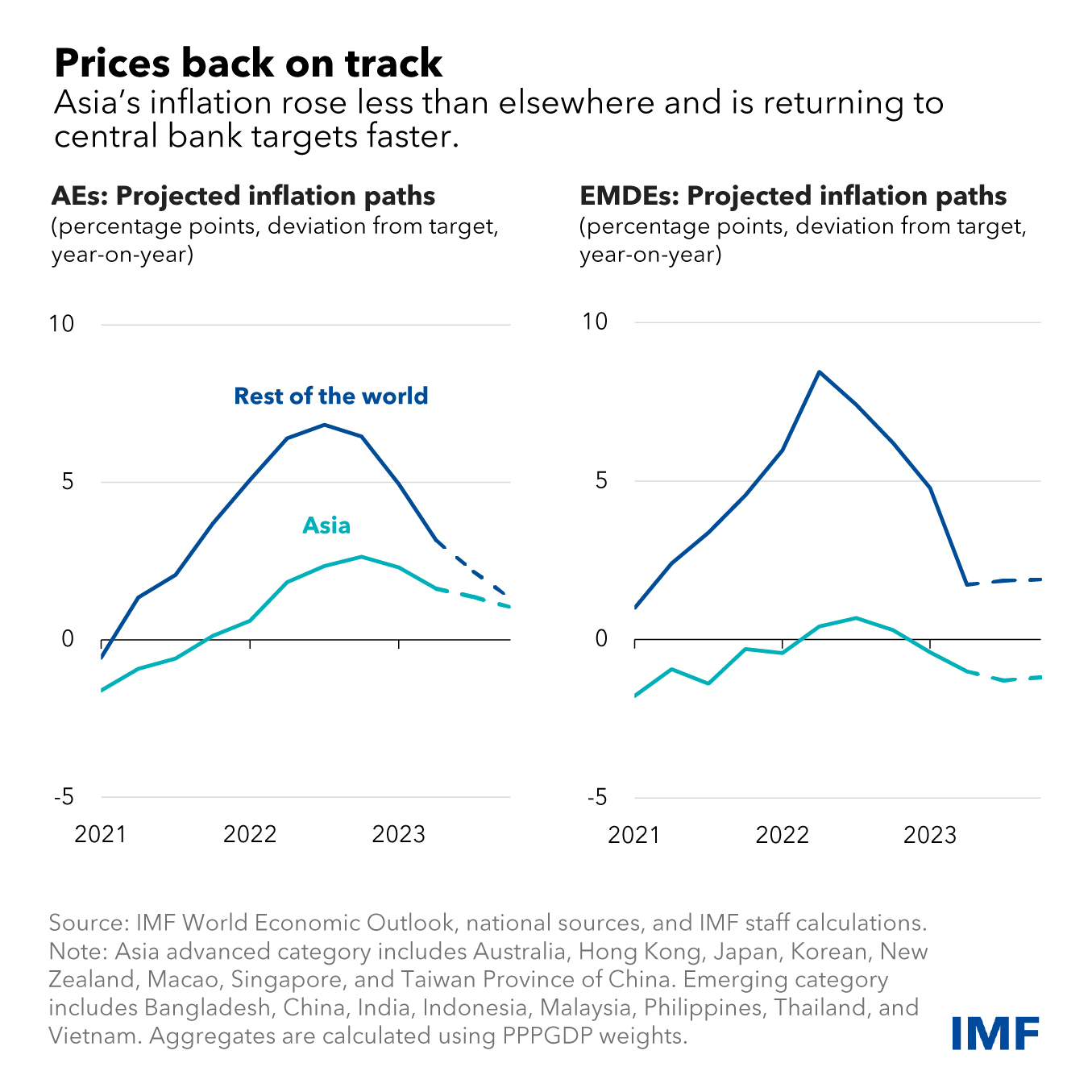A welcome development is that disinflation is on track in Asia, with inflation now expected to return to central bank target ranges next year in most countries. This process is well ahead of most other regions, where inflation remains high and is expected to fall within target only in 2025.