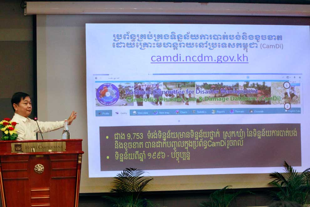Soth Kimkolmony, the NCDM's deputy director-general, makes a presentation during a recent workshop organised by the Ministry of Environment to educate journalists and other media professionals on the dangers associated with climate change. Heng Chivoan