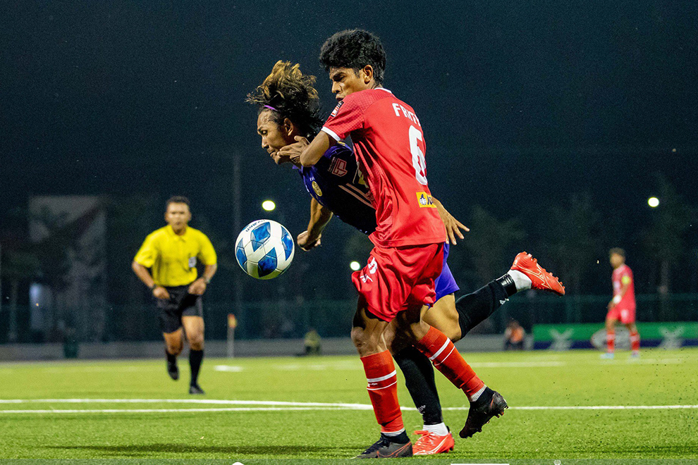 An ISI Dangkor Senchey player (in red) vies for the ball against a Naga World FC player on December 17. ISI Dangkor Senchey FC