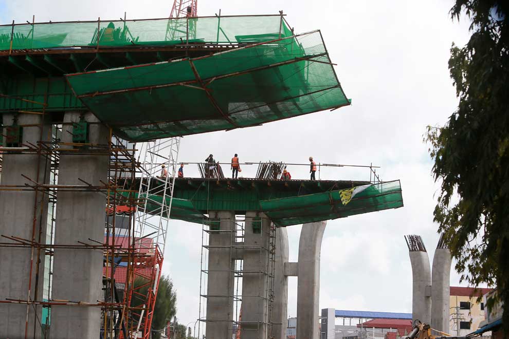Workers at the construction site of a mega interchange connecting three boulevards in Phnom Penh in November. Heng Chivoan