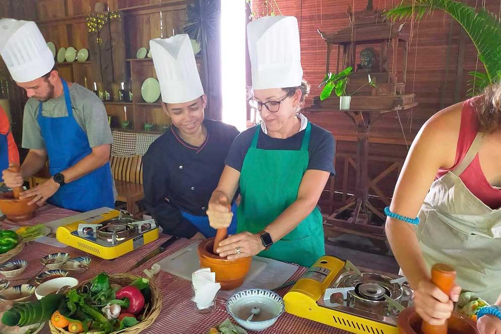 Tourists learn to cook Khmer dishes at one of Changkran Khmer Restaurant’s classes. CHANGKRAN KHMER