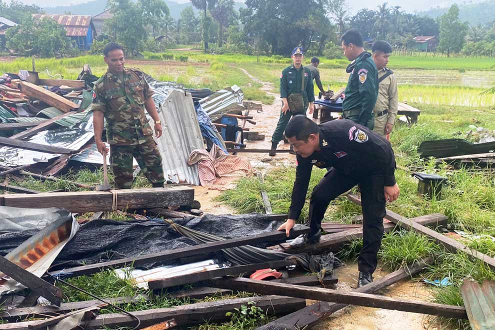 Security forces inspect a house which collapsed due to strong winds in Koh Kong province’s Sre Ambel district on July 31. POLICE