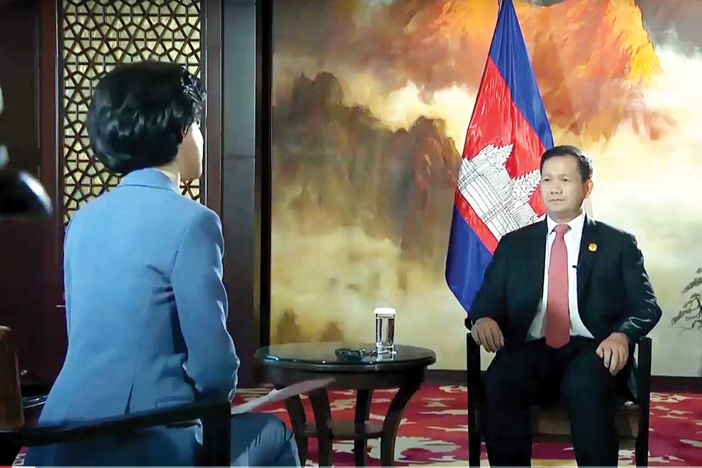 Prime Minister Hun Manet (right) during a television interview with China Media Group in October. FN