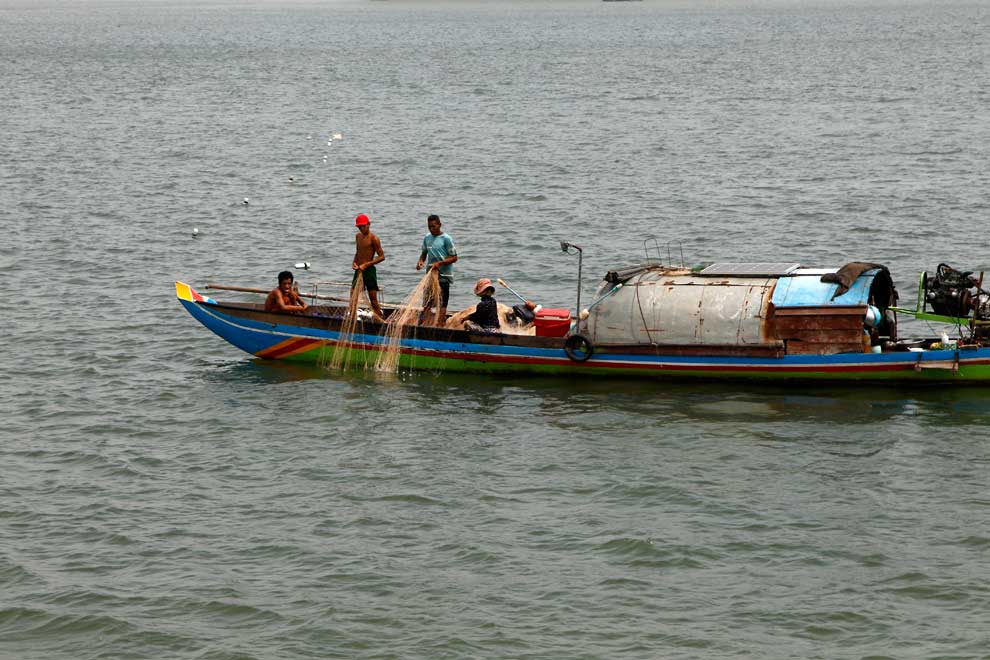 A family cast their nets for fish on the Mekong River on May 25. Heng Chivoan