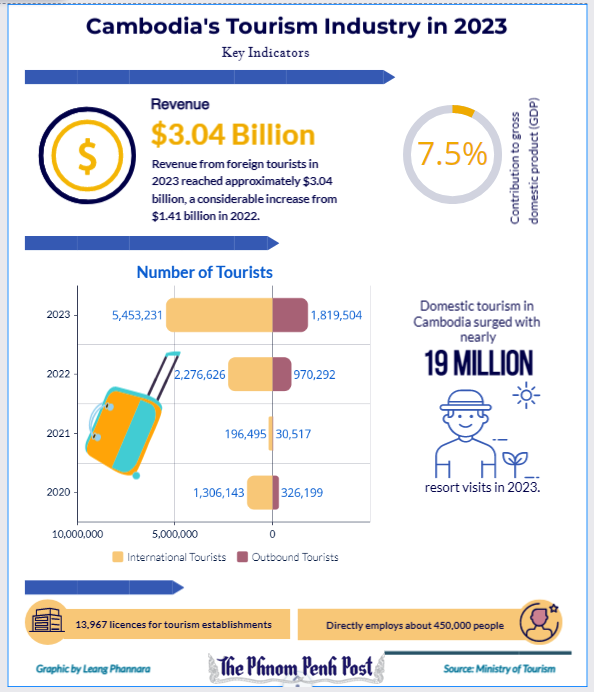 Data from the Ministry of Tourism indicates that in 2023, Cambodia welcomed 5.45 million foreign visitors, a 139.5% increase from 2022. Foreign tourism revenue amounted to about $3.04 billion, up by 115%.