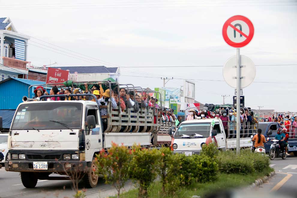 Garment workers commute in open-bed trucks on National Road 3 in May last year. Heng Chivoan