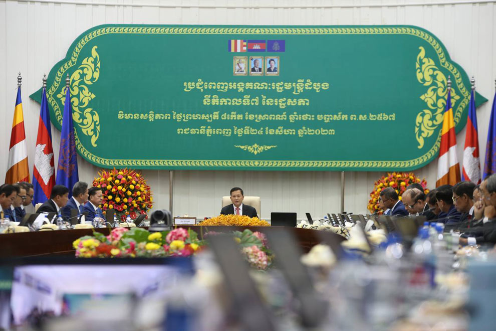 Newly minted Prime Minister Hun Manet chairs the first meeting of the Council of Ministers in Phnom Penh on August 24. SHS