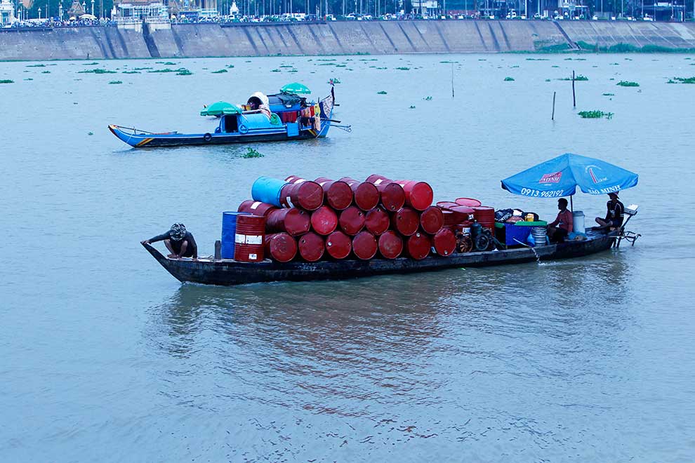 A boat transports barrels of fuel along the Mekong River in Phnom Penh on June 28. Heng Chivoan