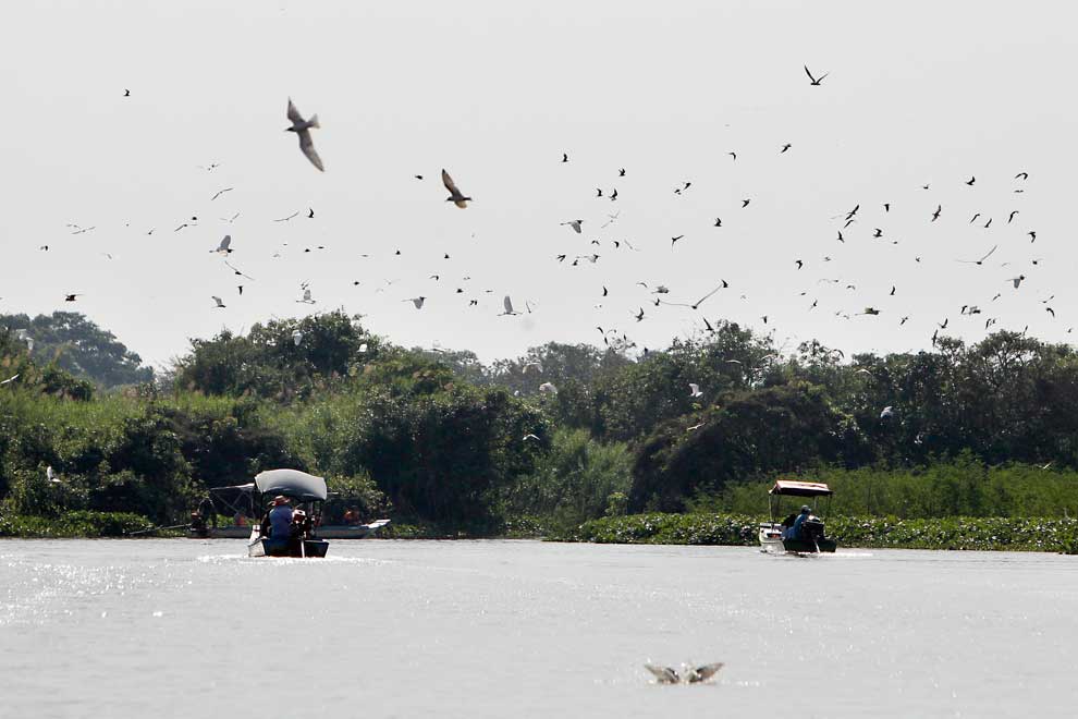 Flocks of waterfowl swoop above two small vessels in Battambang province’s Prek Toal Ramsar site on January 21. Heng Chivoan