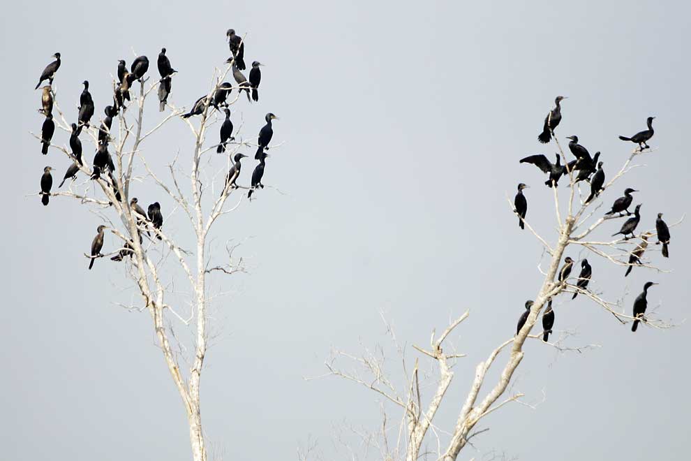 A trio of rare lesser adjutants perch high atop a tree at the Prek Toal site on January 21.Heng Chivoan