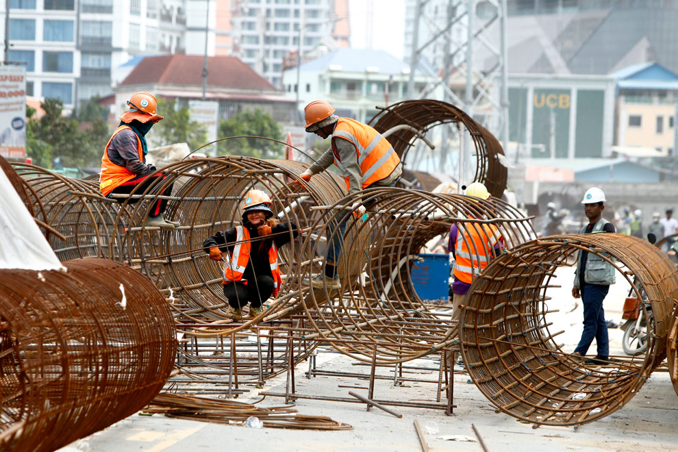 Construction workers prepare rebar cages for an interchange at the intersection of Hun Sen, Royal Cambodian Armed Forces (271) and Monivong (93) boulevards in the capital’s Meanchey district on June 13. Heng Chivoan