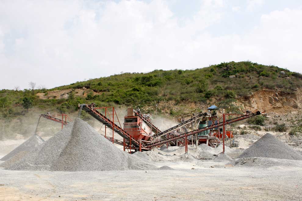 A machine breaks large rocks into small stones near Phnom Chiso in Takeo province. Heng Chivoan