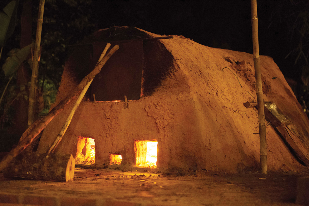 From the outside, the kiln is a clay hump-shaped shell about three metres long and one metre wide. One large and three small holes at the front allow the fire inside to be fed with air and wood, while a flue at the back belches out the smoke. Along the sides, bricked-in holes provide access to the interior and gauges monitor the temperature. The fire burns in a recess at the front while, on a brick platform behind, the pots and bowls cook at temperatures hotter than lava.