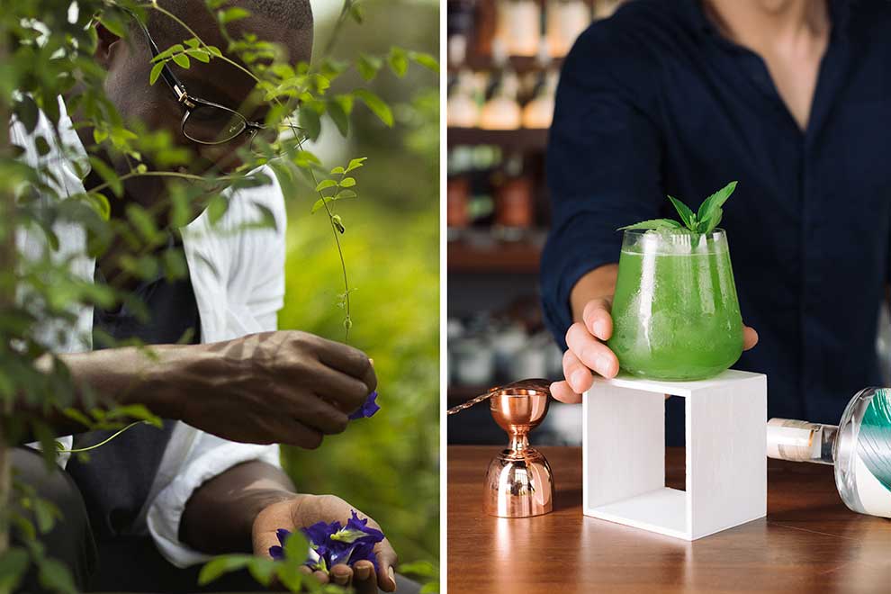 Gin maker Alfie Amayo picking butterfly pea flowers (left) and a gin cocktail.