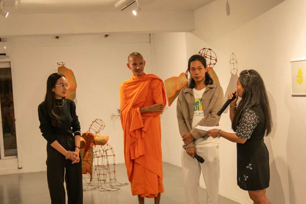 (From left) Leng Kimsreang, Soung Pheakdey and Kong Dara talk about their art at Sa Sa Art Projects. SA SA ART