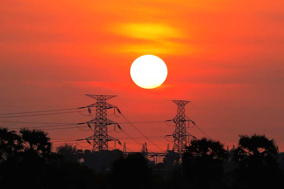 The sun sets behind a high voltage transmission tower in Phnom Penh’s Meanchey district. Hong Menea