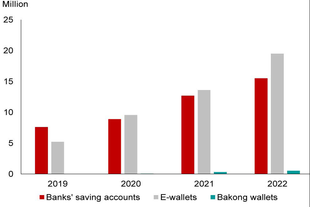 Figure 2. Trend of Bank Accounts, E-wallets, and Bakong Wallets