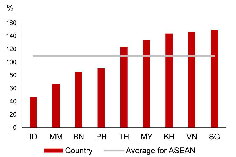 Source: World Bank; National authorities Note: Laos is excluded due to data unavailability. BN = Brunei; KH = Cambodia; ID = Indonesia; MY = Malaysia; MM = Myanmar; PH = Philippines; SG = Singapore; TH = Thailand; VN = Vietnam. Data for Myanmar, Philippines, and Singapore is as of 2020. Data for Thailand is as of 2019. Data for other countries is as of 2021.