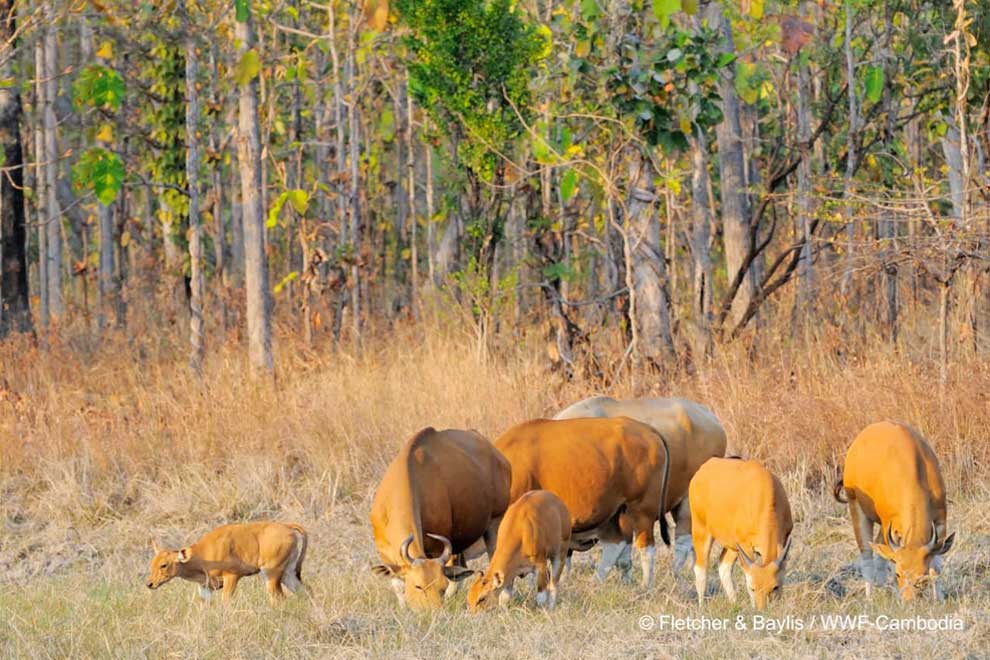 Herd of banteng with juveniles and young calves in the Srepok Wildlife Sanctuary. WWF-CAMbodia
